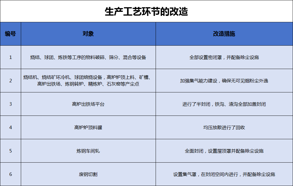 長(zhǎng)強(qiáng)鋼鐵對(duì)于燒結(jié)機(jī)、燒結(jié)礦環(huán)冷機(jī)、高爐爐頂上料、高爐礦槽、高爐出鐵場(chǎng)、轉(zhuǎn)爐、精煉爐等產(chǎn)塵點(diǎn)已全面加強(qiáng)集氣能力建設(shè),配備了除塵設(shè)施。高爐出鐵場(chǎng)平臺(tái)已經(jīng)進(jìn)行了封閉改造,鐵溝、渣溝加蓋封閉:高爐爐頂料罐均壓放散廢氣均進(jìn)行回收處理。煉鋼車間封閉,配備了屋頂三次除塵罩。廢鋼切割在封閉的空間內(nèi)進(jìn)行,設(shè)置了集氣罩,并配備了除塵設(shè)施。生產(chǎn)工藝過(guò)程控制措施滿足意見(jiàn)中相關(guān)的要求。