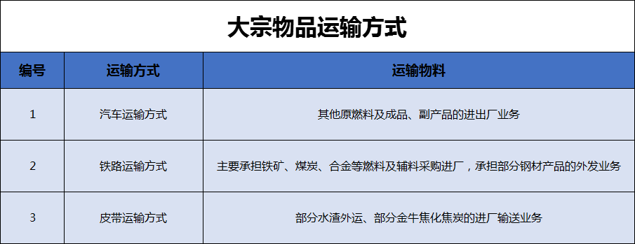 天鐵公司進出廠區(qū)的大宗物料和產(chǎn)品主要采用鐵路運輸方式、汽車運輸方式、皮帶運輸方式,其中鐵路運輸方式主要承擔(dān)鐵礦、煤炭、合金等燃料及輔料采購進廠,承擔(dān)部分鋼材產(chǎn)品的外發(fā)業(yè)務(wù);汽車運輸方式承擔(dān)其他原燃料及成品、副產(chǎn)品的進出廠業(yè)務(wù);皮帶運輸方式承擔(dān)部分水渣外運、部分金牛焦化焦炭的進廠輸送業(yè)務(wù)。