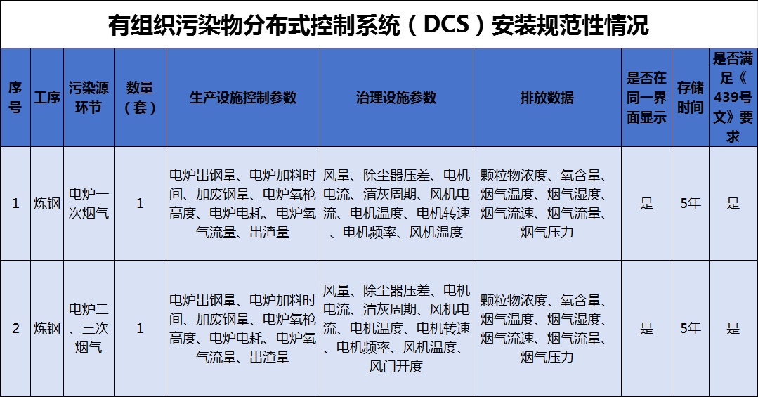 依據(jù)《意見》《439號文》要求,中首特鋼電爐煙氣污染源污染治理設(shè)施均已安裝分布式控制系統(tǒng)(DCS)共2套,DCS系統(tǒng)可記錄企業(yè)環(huán)保設(shè)施運行及相關(guān)生產(chǎn)過程主要參數(shù),可以查詢各除塵設(shè)施所有運行參數(shù)及CEMS在線監(jiān)測數(shù)據(jù),可體現(xiàn)生產(chǎn)負荷和設(shè)備啟停的主要生產(chǎn)工藝參數(shù)的相關(guān)功能,任意參數(shù)曲線可組合至同一個界面中查看;數(shù)據(jù)存儲能力具備保存五年以上歷史數(shù)據(jù),符合政策要求。
