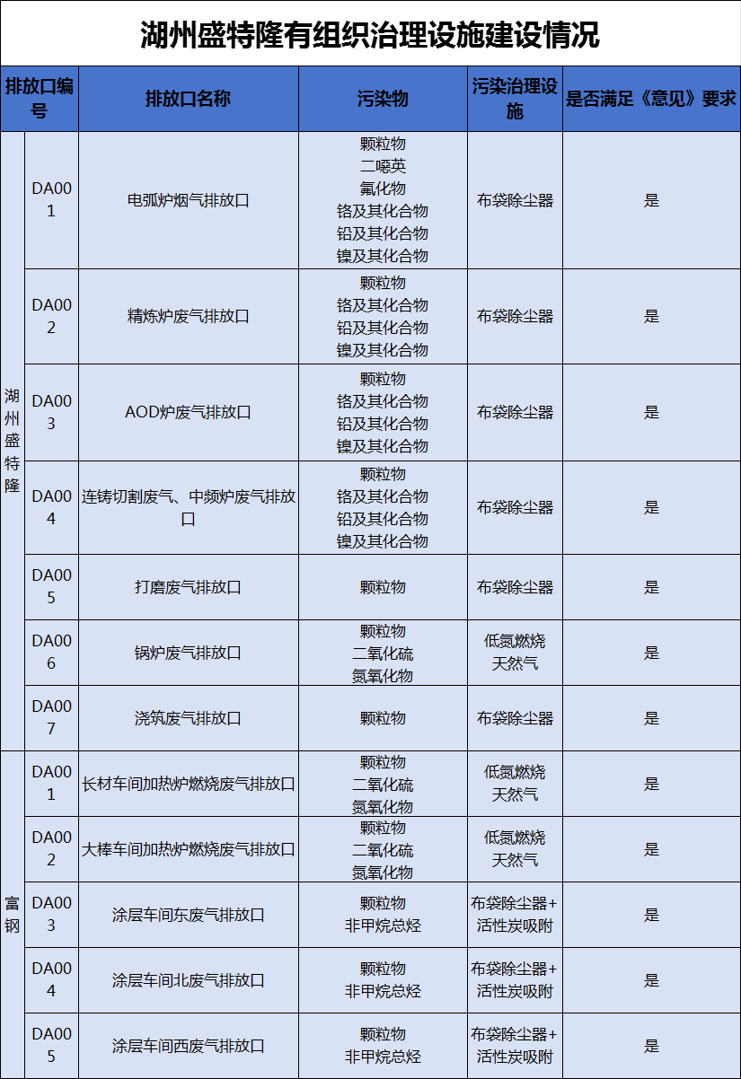通過超低排放改造,湖州盛特隆對(duì)于公司各有組織排放源配套了各種污染治理設(shè)施:電爐煙氣采用第四孔爐內(nèi)排煙+密閉罩+屋頂罩+袋式除塵器的治理技術(shù),其余點(diǎn)位均采用袋式除塵;除此之外,涂層車間噴粉過程中產(chǎn)生少量有機(jī)廢氣采用活性炭吸附法工藝,符合“意見”中對(duì)有組織廢氣治理的技術(shù)要求。