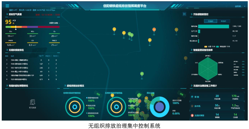 信陽鋼鐵已建立無組織管控平臺,集成了全廠原料、燒結(jié)、球團(tuán)、石灰、高爐、煉鋼、軋鋼、鋼渣處理、水渣微粉等各工序的生產(chǎn)運(yùn)行信號、治理運(yùn)行信號、環(huán)境監(jiān)測數(shù)據(jù)、視頻監(jiān)控數(shù)據(jù)等??蓪崿F(xiàn)全廠重點污染區(qū)域的視頻數(shù)據(jù)實時調(diào)閱、存儲、查詢、回放,全廠環(huán)境空氣質(zhì)量監(jiān)測微站數(shù)據(jù)管理及分析,全廠無組織排放源TSP監(jiān)測儀數(shù)據(jù)管理及分析,全廠治理設(shè)備運(yùn)行狀態(tài)數(shù)據(jù)管理及分析,全廠無組織排放治理過程數(shù)據(jù)集中管理,全廠無組織排放源生產(chǎn)、治理、監(jiān)控監(jiān)測數(shù)據(jù)同步展示,異常報警管理,智能報表等功能。