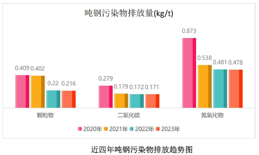 信陽鋼鐵近四年噸鋼污染物排放量數(shù)據(jù)見下圖。2023年與2020年相比,噸鋼氮氧化物、二氧化硫和顆粒物排放量分別下降了45%、39%和47%,超低排放改造工作以來全廠顆粒物、二氧化硫、氮氧化物排放均達(dá)到超低標(biāo)準(zhǔn),信陽鋼鐵以實施超低排放改造取得的減排成果為基礎(chǔ),不斷提升環(huán)保超低排放水平,使減排成果不斷升級。