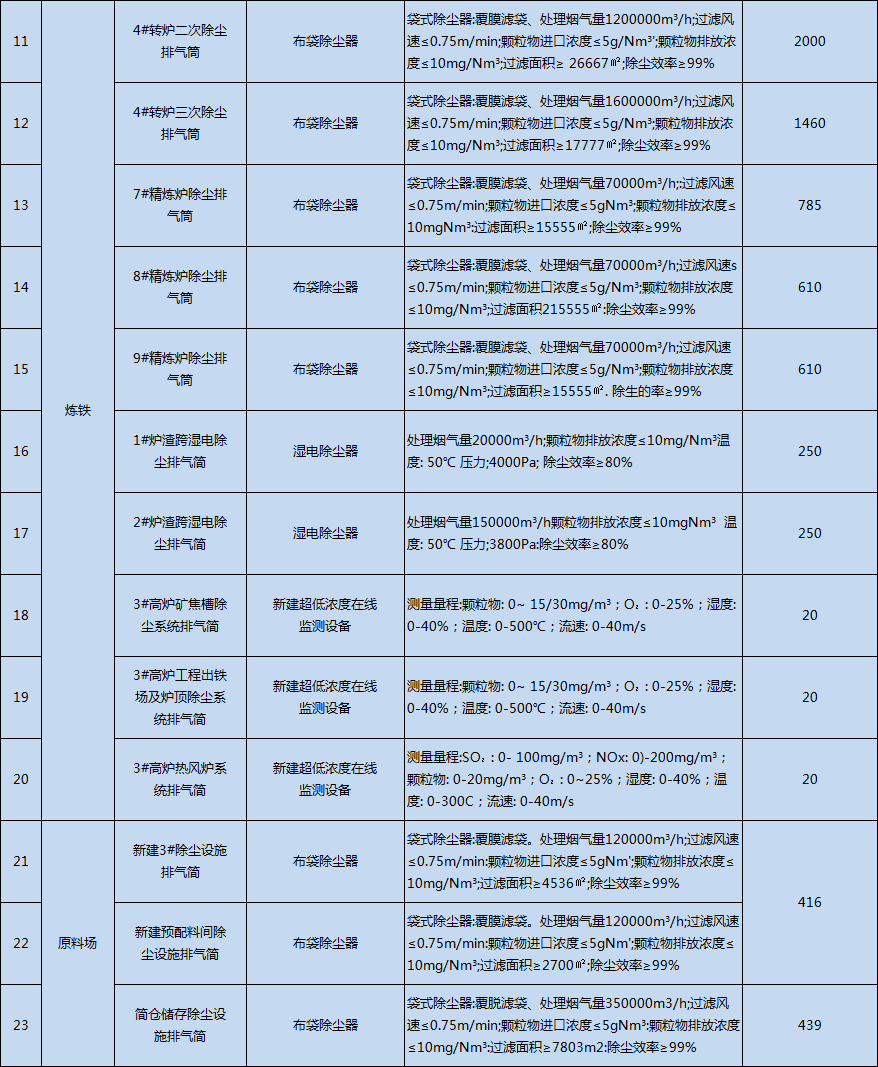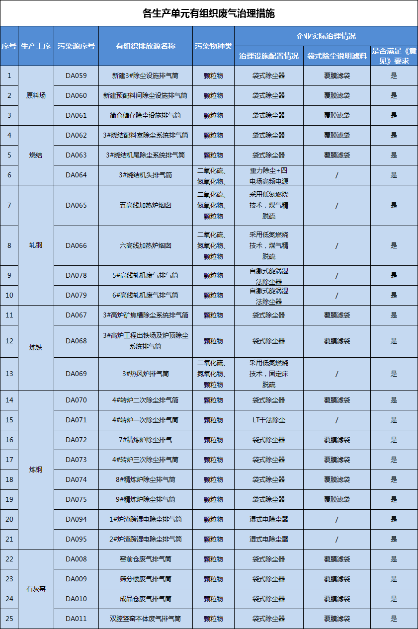 對全廠25個有組織排放源,根據(jù)不同的工序和污染物種類等,分別配備不同的治理設(shè)施進行有效的治理控制,降低污染的產(chǎn)生,滿足超低排放要求。