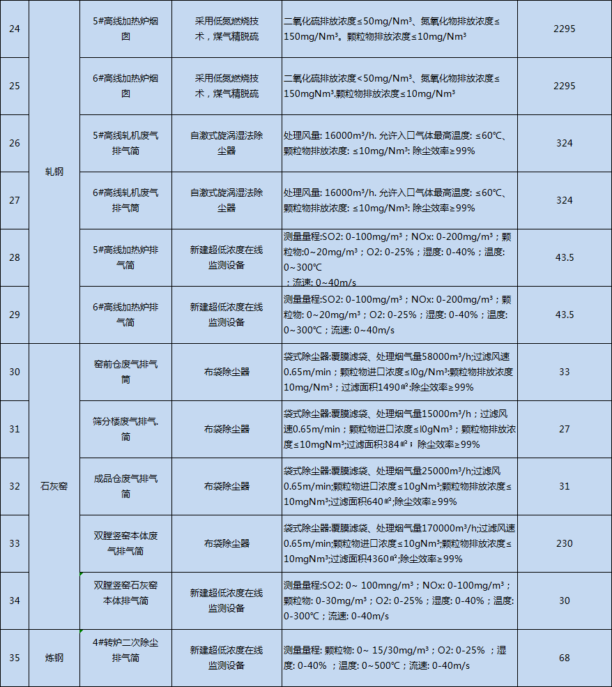 青島特鋼本次納入超低排放評估范圍的有組織排放口共25個:原料供卸系統(tǒng)3個、燒結(jié)工序3個、煉鐵工序3個、煉鋼工序8個、軋鋼工序4個、石灰窯4個。除塵設(shè)施主要采用覆膜濾料袋式除塵器先進工藝;煙氣脫硫采用循環(huán)流化床脫硫;煙氣脫硝采用選擇性催化還原(SCR)高效脫硝技術(shù)。