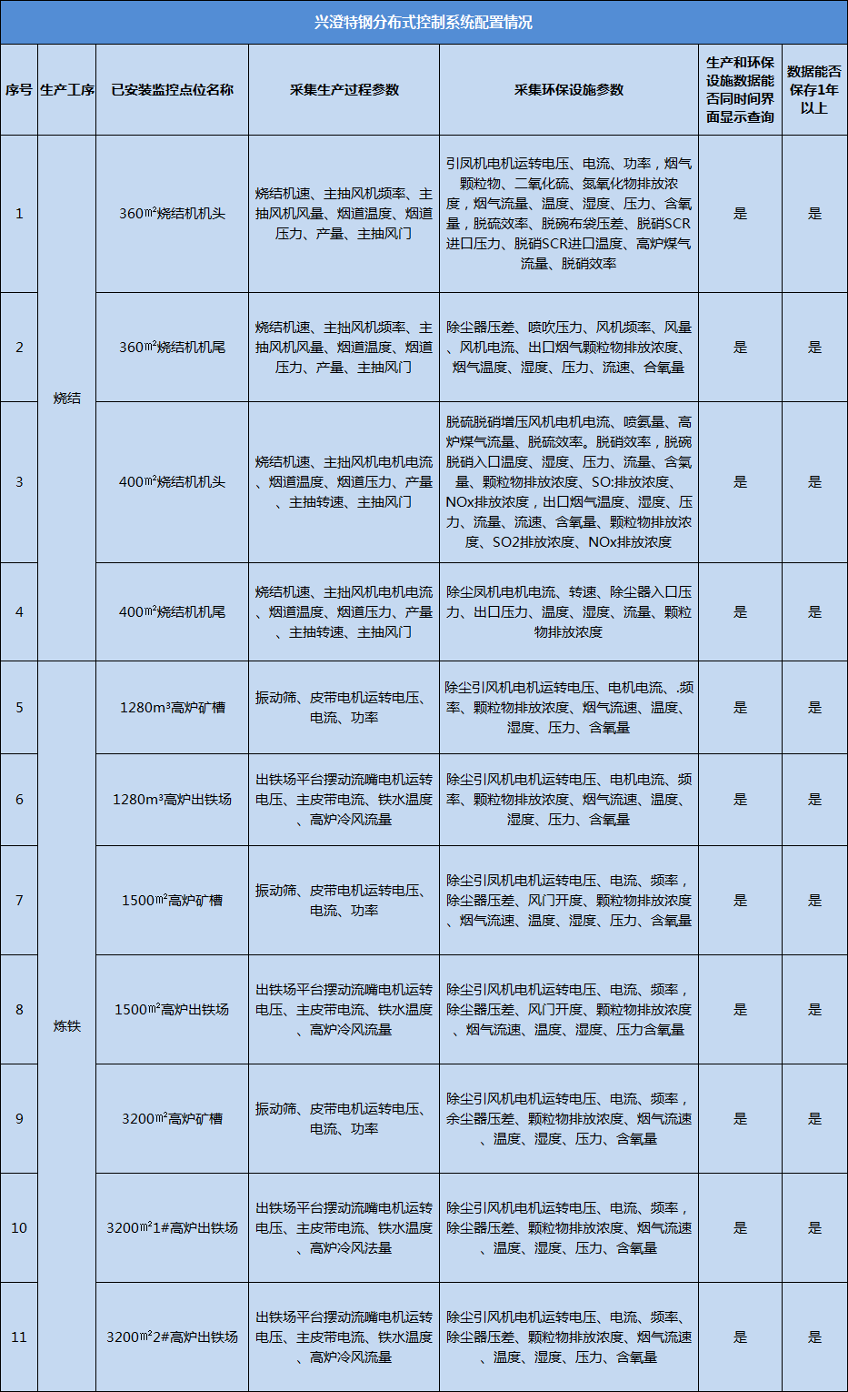 興澄特鋼按照《意見》要求,在燒結(jié)機(jī)機(jī)頭、燒結(jié)機(jī)機(jī)尾、高爐礦槽、高爐出鐵場(chǎng)、鐵水預(yù)處理、轉(zhuǎn)爐二次煙氣、電爐煙氣、自備電站排氣筒等生產(chǎn)設(shè)施和污染源治理設(shè)施上安裝DCS或具備其功能的分布式控制系統(tǒng),記錄企業(yè)環(huán)保設(shè)施運(yùn)行及相關(guān)生產(chǎn)過程主要參數(shù),實(shí)時(shí)掌握生產(chǎn)設(shè)備和環(huán)保設(shè)施的運(yùn)行情況、污染治理及排放情況、污染源停限產(chǎn)及錯(cuò)峰生產(chǎn)情況等信息,并接入超低排放一體化平臺(tái),平臺(tái)可直接查詢各除塵、脫硫、脫硝設(shè)施運(yùn)行參數(shù),方便企業(yè)隨時(shí)管控。