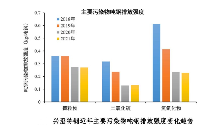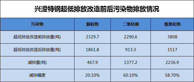 通過這次超低排放改造,興澄特鋼污染物排放量明顯下降,其中顆粒物、二氧化硫、氮氧化物排放量分別下降20.1%、60.1%、58.7%,噸鋼排放強(qiáng),度分別達(dá)到0.27kg/噸鋼、0.13 kg/噸鋼、0.23 kg/噸鋼,達(dá)到國(guó)內(nèi)外先進(jìn)水平。