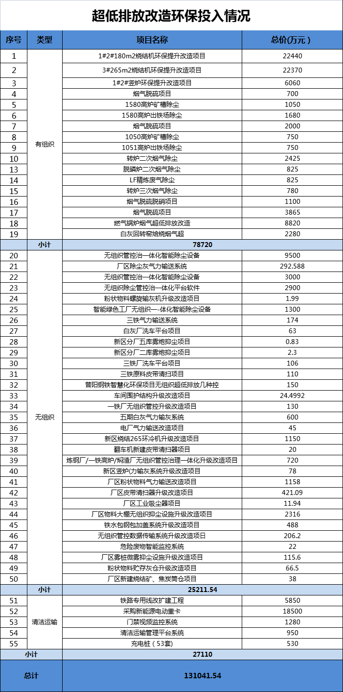 普陽(yáng)鋼鐵共投入近20億元環(huán)保治理資金累計(jì)實(shí)施燒結(jié)機(jī)脫硫、脫硝、除塵、豎爐脫硫脫硝、脫白、白灰窯脫硫脫硝除塵、煉鐵除塵、軋鋼加熱爐脫硫脫硝、封閉料場(chǎng)、超低排放集中控制系統(tǒng)等100余項(xiàng)環(huán)保提升治理項(xiàng)目,其中包括:有組織排放改造投入約7.87億元,無組織排放改造投入約2.52億元,清潔運(yùn)輸改造約2.71億元,其他投入約6.9億元等。