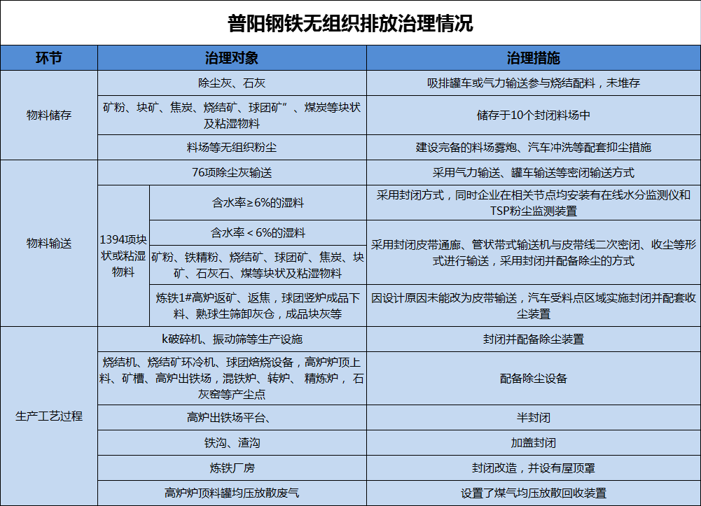 普陽(yáng)鋼鐵在所有有組織廢氣排放口,均按超低排放要求配套了除塵、脫硫、脫硝等污染物治理設(shè)施進(jìn)行規(guī)范化改造,進(jìn)行有組織排放污染防治。