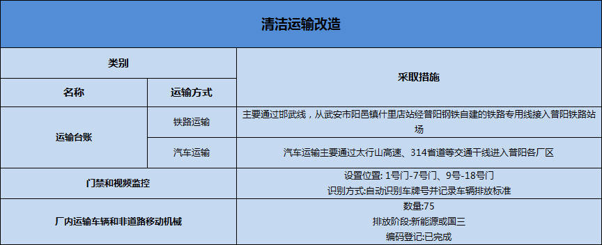 普陽(yáng)鋼鐵為達(dá)到超低排放要求,開展了清潔運(yùn)輸全面改造工程,主要包括:鐵路專用線改擴(kuò)建工程、采購(gòu)新能源電動(dòng)重卡、門禁視頻監(jiān)控系統(tǒng)、清潔運(yùn)輸管理平臺(tái)系統(tǒng)、充電樁等,于2022年6月全部整改完畢。