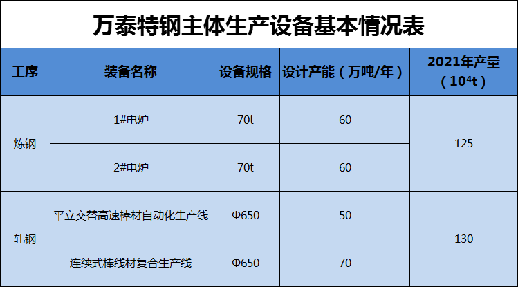 萬(wàn)泰特鋼目前擁有2座70噸電弧爐,設(shè)計(jì)產(chǎn)能60萬(wàn)噸/a。主要生產(chǎn)設(shè)施及產(chǎn)量情況見(jiàn)下表。