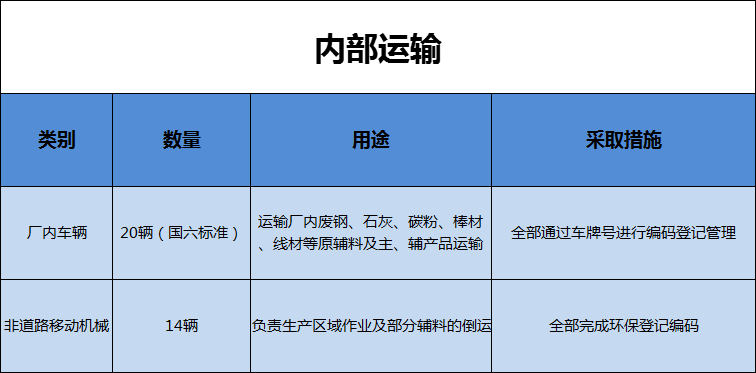 萬(wàn)泰特鋼對(duì)于負(fù)責(zé)場(chǎng)內(nèi)運(yùn)輸?shù)膬?nèi)部運(yùn)輸車輛,全部通過(guò)車牌號(hào)進(jìn)行編碼登記管理,對(duì)于所有非道路移動(dòng)機(jī)械全部完成環(huán)保等級(jí)編碼。