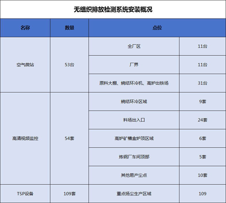 新金鋼鐵全廠布設(shè)空氣質(zhì)量微站53套;高清視頻監(jiān)控設(shè)施54套;所有視頻記錄保存3個(gè)月,其他歷史記錄保存1年以上,能夠記錄所有無(wú)組織排放源附近監(jiān)測(cè)、監(jiān)控和治理設(shè)施運(yùn)行情況以及空氣質(zhì)量監(jiān)測(cè)微站監(jiān)測(cè)數(shù)據(jù),做到“自證守法”,數(shù)據(jù)正在逐步上傳。