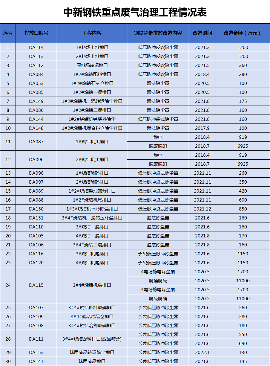 中新鋼鐵對全廠103個廢氣有組織排放口的污染治理進行了超低排放改造,一方面,加強源頭控制,一方面針對不同的排放源采取了對應的治理,最大化減少污染物排放。具體情況如下: