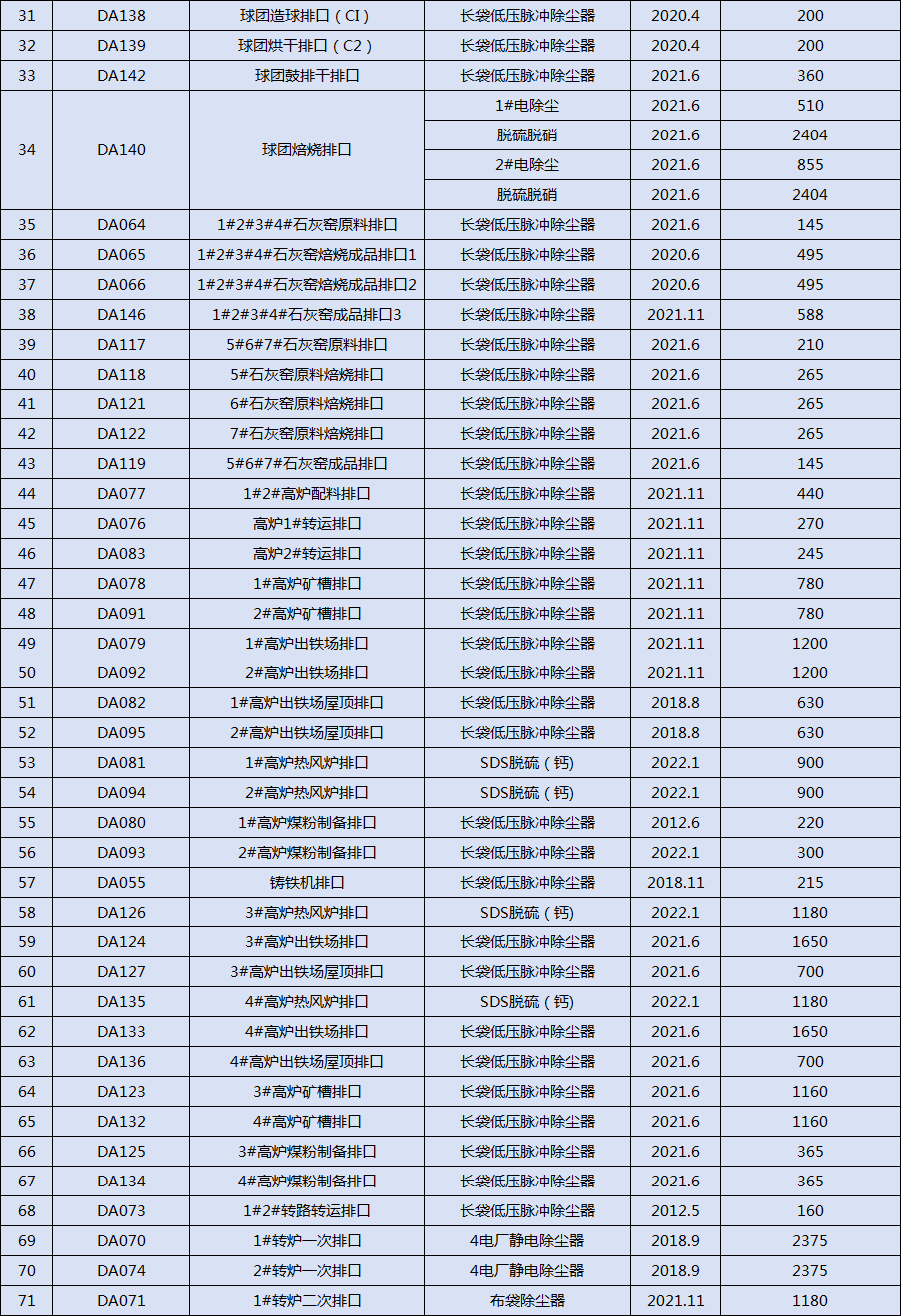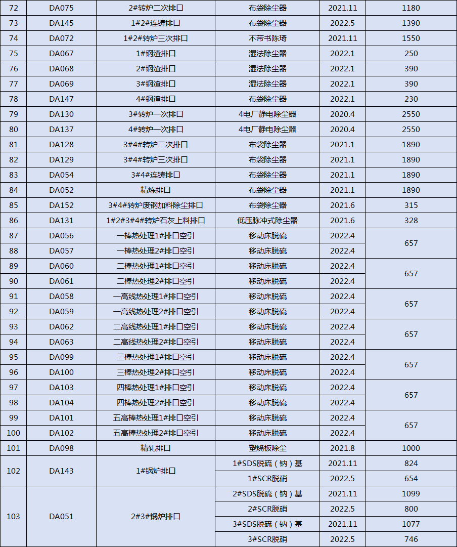 對全廠103個有組織排放源口,根據不同的工序和污染物種類等,分別配備不同的治理設施進行有效地治理控制,降低污染的產生,滿足超低排放要求。
