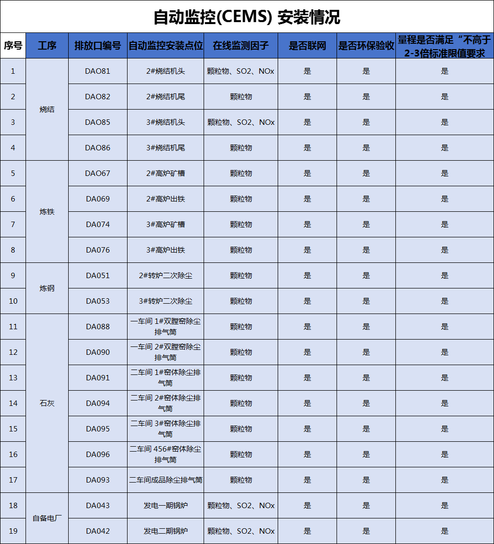 聯(lián)鑫鋼鐵評(píng)估監(jiān)測(cè)范圍內(nèi)共安裝自動(dòng)監(jiān)控設(shè)施19套,均與生態(tài)環(huán)境主管部門(mén)聯(lián)網(wǎng)。