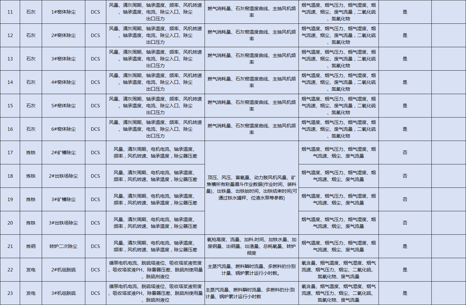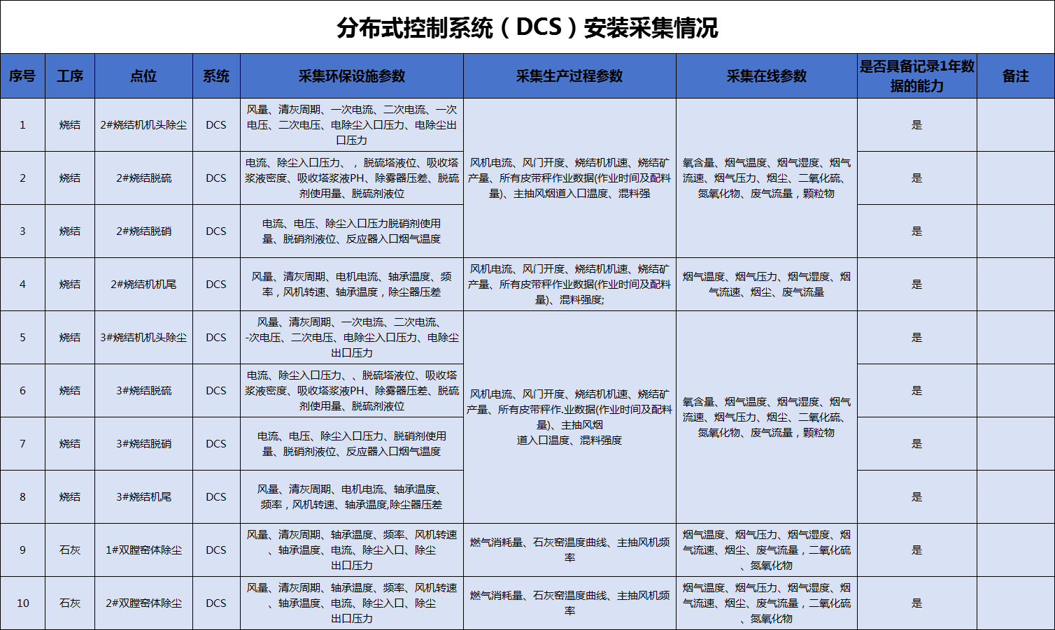 依據(jù)《意見(jiàn)》要求,聯(lián)鑫鋼鐵對(duì)燒結(jié)機(jī)機(jī)頭、燒結(jié)機(jī)機(jī)尾、高爐礦槽、高爐出鐵、轉(zhuǎn)爐二次煙氣、自備電廠等污染源治理設(shè)施安裝分布式控制系統(tǒng),記錄企業(yè)環(huán)保設(shè)施運(yùn)行及相關(guān)生產(chǎn)過(guò)程關(guān)鍵參數(shù),可查詢(xún)脫硫、脫硝、除塵、CEMS在線監(jiān)測(cè)數(shù)據(jù),可體現(xiàn)生產(chǎn)負(fù)荷和設(shè)備啟停的主要生產(chǎn)工藝參數(shù)的相關(guān)功能,任意參數(shù)曲線可組合至統(tǒng)一界面查看,且所有數(shù)據(jù)均具備儲(chǔ)存二年以上歷史數(shù)據(jù)的能力。