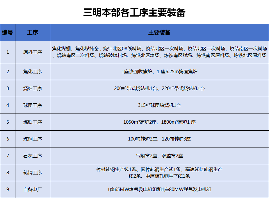 三明本部主要生產(chǎn)系統(tǒng)包括原料工序、焦化工序、燒結(jié)工序、球團(tuán)工序、煉鐵工序、煉鋼工序、石灰工序、軋鋼工序、自備電廠等,各工序主要裝備情況如下: