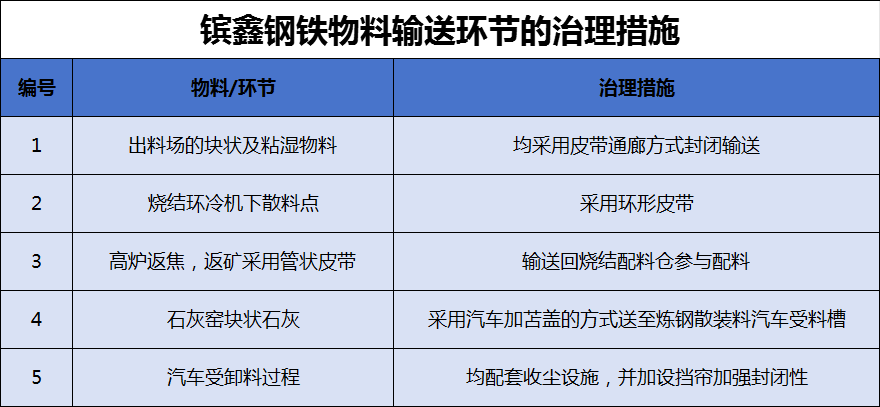 鑌鑫鋼鐵塊狀和沾濕物料輸送點(diǎn)位共涉及1699個(gè),分別根據(jù)不同的物料分別采取不通過的治理措施;粉狀物料輸送無組織源點(diǎn)位53個(gè),全部采用氣力輸送、吸排罐車等密閉輸送方式,或者直送配料倉(cāng),符合《意見》要求。