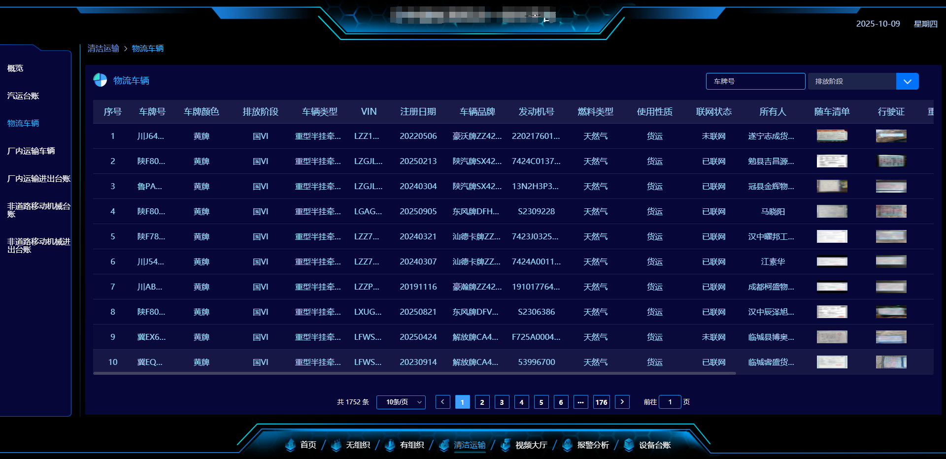 智能門禁系統(tǒng)連接智慧物流系統(tǒng),形成清潔運(yùn)輸臺賬,實(shí)時(shí)上傳車牌號碼、車牌顏色、排放階段、車輛類型、進(jìn)廠時(shí)間、進(jìn)廠抓拍圖(車頭、頂拍)、物料類型、物料毛重、皮重、凈重,出廠時(shí)間、出廠抓拍圖(車頭、頂拍)、隨車環(huán)保清單照片、發(fā)動機(jī)編號、VIN碼,并對進(jìn)出廠時(shí)間、車牌號、物料種類、排放階段等主要信息具備篩選功能。同時(shí),應(yīng)增加統(tǒng)計(jì)功能,統(tǒng)計(jì)各物料種類的車次、車輛數(shù)量、重量等信息。