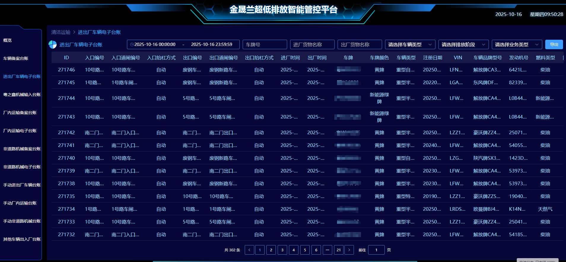 通過將現(xiàn)有門禁系統(tǒng)及地磅計量系統(tǒng)數(shù)據(jù)集成至超低排放智能管控平臺,實現(xiàn)了對運輸車輛信息的全面數(shù)字化管理。平臺實時采集并展示包括車輛運輸物料類型(原料、燃料、輔料、廢污、成品)、名稱、重量、運輸類型(收/發(fā)貨)、來源地、目的地、進(jìn)出廠時間、抓拍圖片、車牌號及排放階段(VIN)等關(guān)鍵數(shù)據(jù),形成完整、可追溯的清潔運輸電子臺賬,為超低排放管控提供數(shù)據(jù)支撐。
