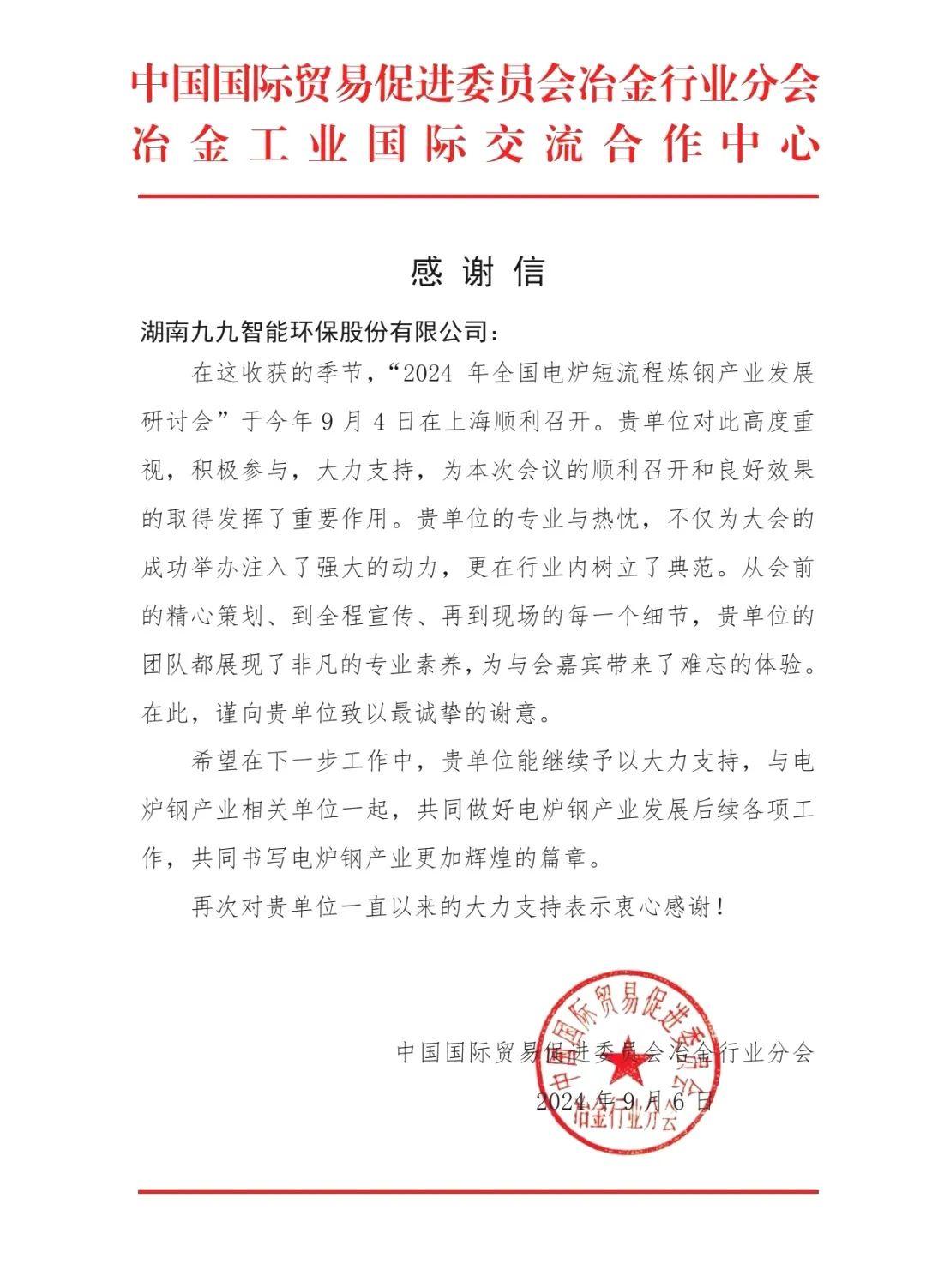 9月6日,九九智能環(huán)保收到了來自中國(guó)國(guó)際貿(mào)易促進(jìn)委員會(huì)冶金行業(yè)分會(huì)發(fā)來的感謝信。信中提到,在剛剛落下帷幕的2024年全國(guó)電爐短流程煉鋼產(chǎn)業(yè)發(fā)展研討會(huì)中,九九智能環(huán)保作為協(xié)辦單位在會(huì)前的精心策劃到全程宣傳過程中為本次的會(huì)議召開發(fā)揮了重要作用。