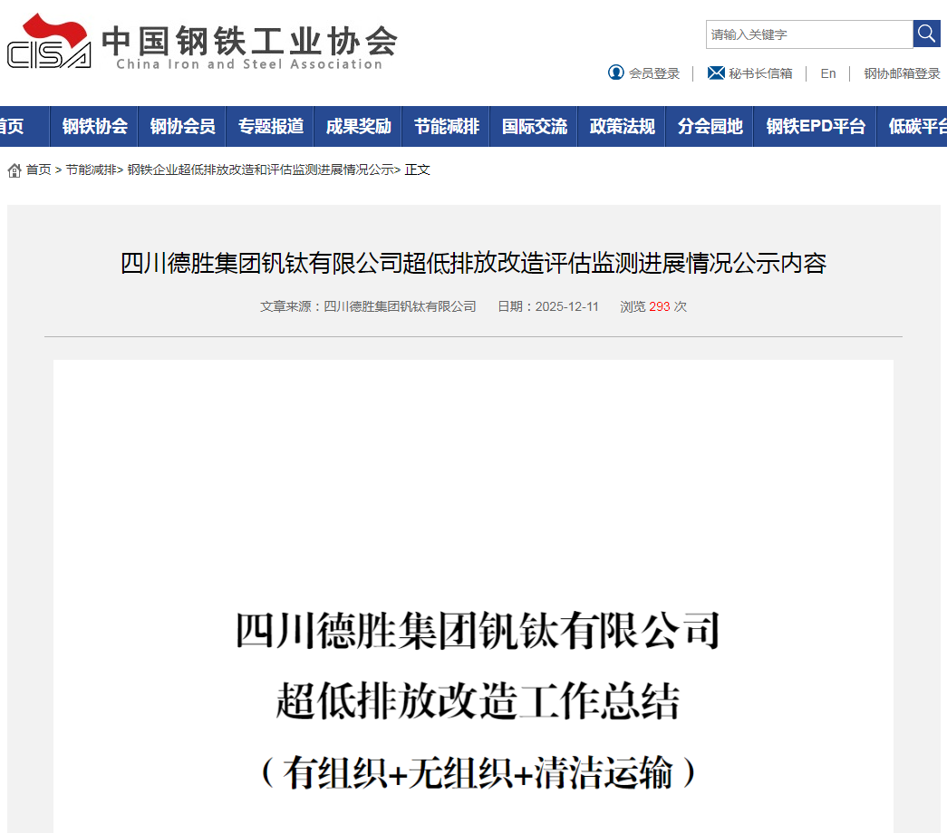 此前,四川德勝集團釩鈦有限公司超低排放改造評估監(jiān)測進展情況已在中鋼協(xié)官網(wǎng)掛網(wǎng)進行公示。