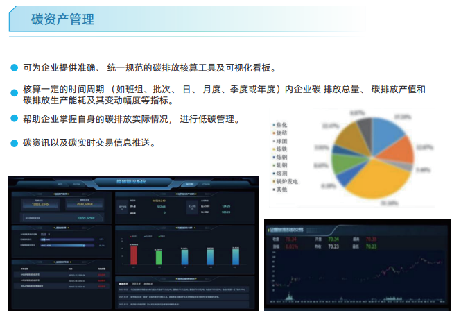 “碳資產(chǎn)管理”模塊提供標準化核算工具,自動計算不同周期內(nèi)的碳排放總量、碳強度等關(guān)鍵指標,并可視化呈現(xiàn)。同時,推送實時碳市場資訊與交易信息,助力決策。