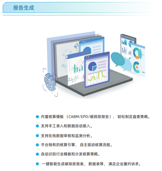 “報告生成”功能內(nèi)置各類標準模板,支持數(shù)據(jù)自動采集與審核,利用智能核算引擎,能一鍵生成滿足政府履約、產(chǎn)品認證等多種需求的合規(guī)報告,極大提升效率與準確性。