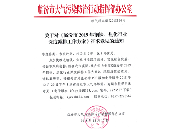 山西臨汾市大氣污染防治行動指揮部辦公室于201812月發(fā)布《臨汾市2019年鋼鐵、焦化行業(yè)深度減排工作方案》征求意見稿,并于20193月正式發(fā)布。